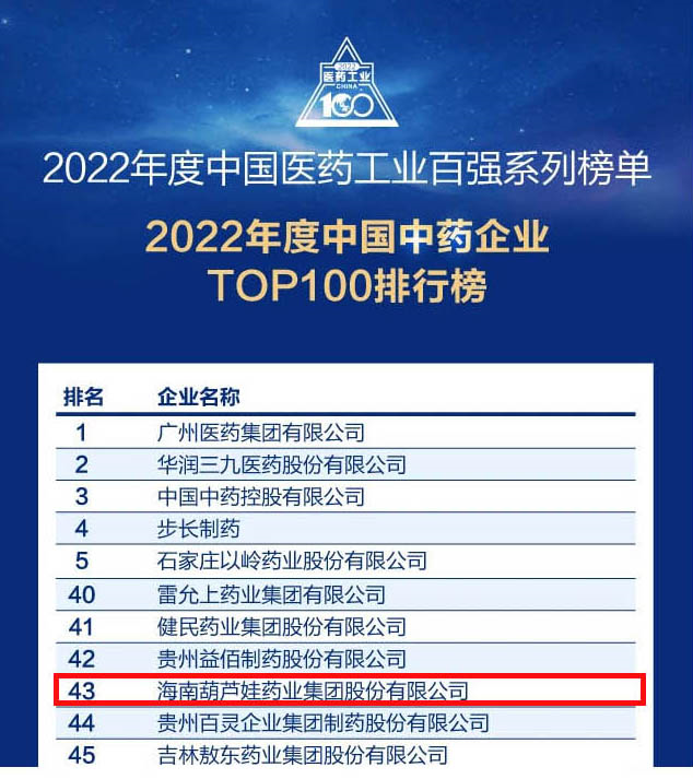 会议期间,一年一度的中国医药工业百强系列榜单隆重揭晓,金年会药业集团凭借领先的研发优势和扎实的生产实力以及稳健的市场推广能力,连续第四年成功入选“2022年度中国中药企业TOP100排行榜” ,排名稳步上升至第43位。